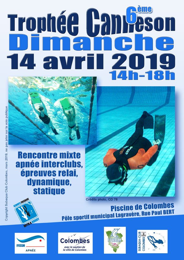 Le trophée Gérard Canneson aura lieu le Dimanche 14 avril 2019, à la piscine de Colombes de 14h à 18h.